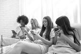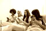 Girlfriends using and watching smartphones on bed
