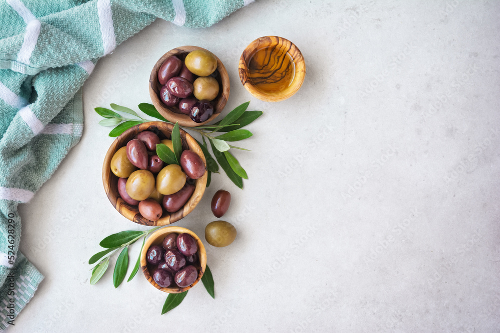 Wooden bowls with delicious olives and oil