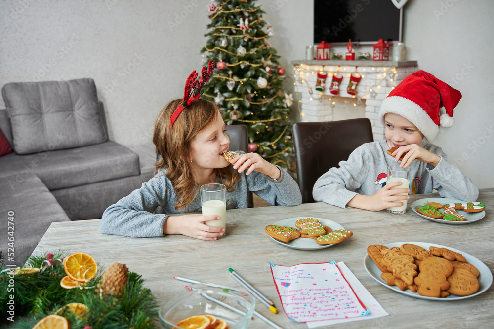 Sibling children drinks milk with Christmas cookies in living room. Boy wearing santa red hat. Concept happy Christmas holiday.
