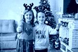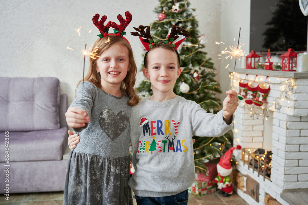 Happy childen boy and girl with sparklers in living room near christmas tree and fireplace. Christmas time and funny holidays concept.
