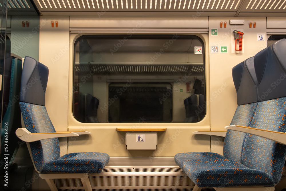 A window seat on a train passing through a tunnel. Empty seats in the night train