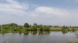 Panorama rzeki Odry w obszarach polnych, w tle zarośla i nieliczne drzewa w porze letniej na tle nieznacznie pochmurnego nieba