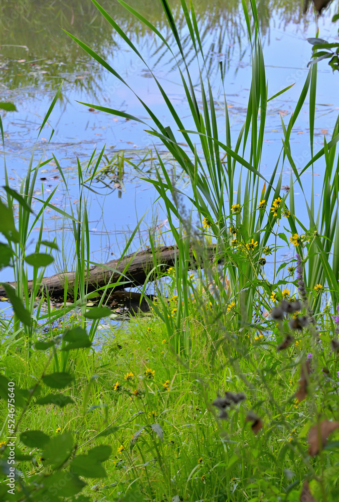 A grassy bank of a forest river on a summer day