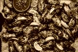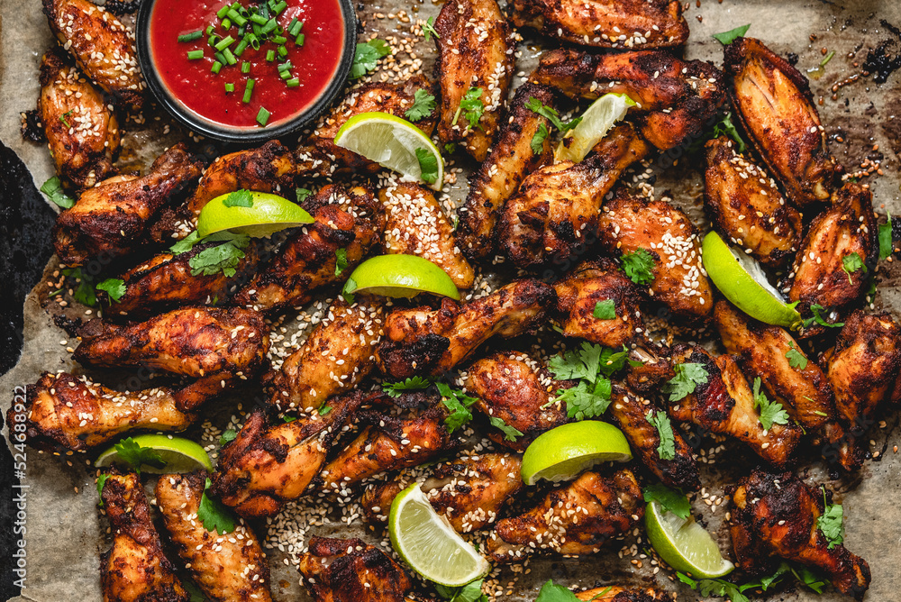 Baked delicious homemade chicken wings with fresh herbs, tomato dip and lime
