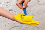 The volume knob on the amplifier turns the female hand, close-up, selective focus, top view.