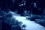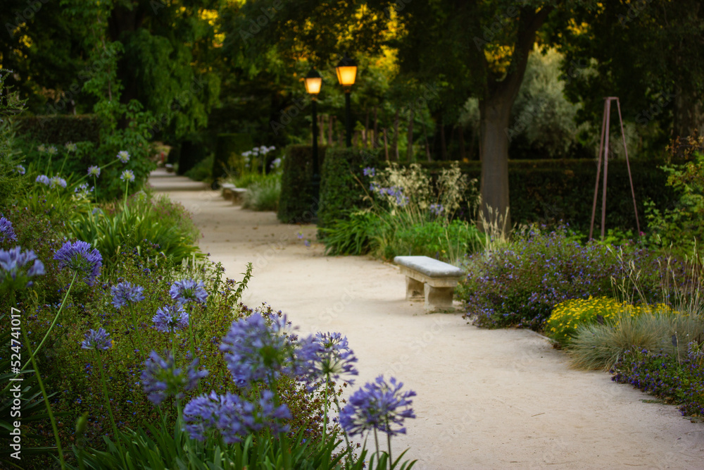 A path, a straight path in a botanical garden in the evening. A street lights illumination. Beautiful flowering bushes with purple flowers. Calm atmosphere. Natural landscape. Gardening, floriculture.