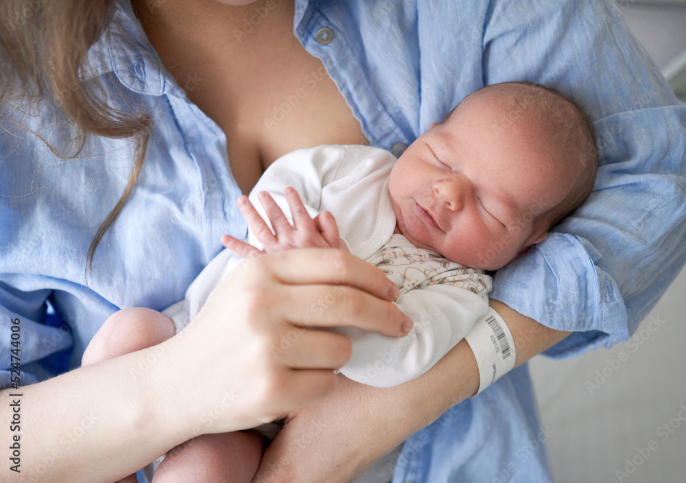 Newborn baby in mother's hands. Sleep the first days of life. happy kid. Cute little newborn baby sleep soundly