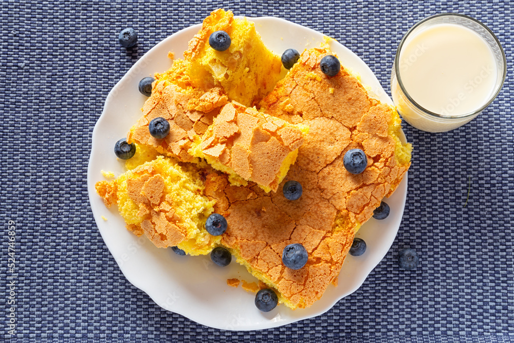 handmade sponge cake or sponge biscuit with blueberries on white ceramic plate.
