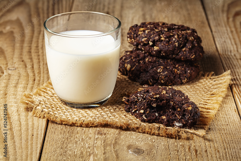chocolate oatmeal cookies and glass of milk on woden table.