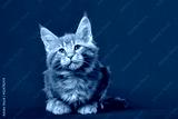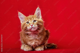 A beautiful red Maine Coon kitten lies on a red background in the studio...