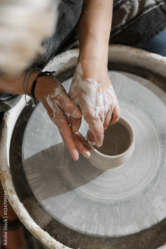 Hands close-up at pottery workshop learning to make clay bowl. People doing handmade dishes. Lesson for adults at ceramics studio. Top view