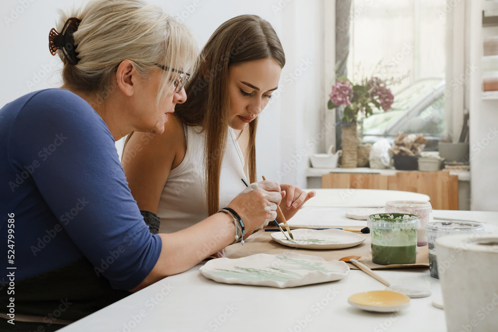 Woman potter with paintbrush glazing, painting on plate in workshop, working in pottery studio. People enjoying creative process, decorating ceramic after firing in oven. Hobby, small business