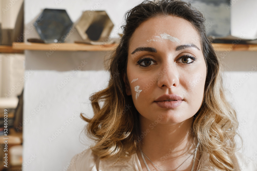 Close-up dirty woman potter portrait, self-employed pottery artist in creative studio working with raw clay Cheerful ceramics art teacher in workshop