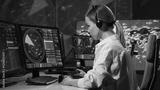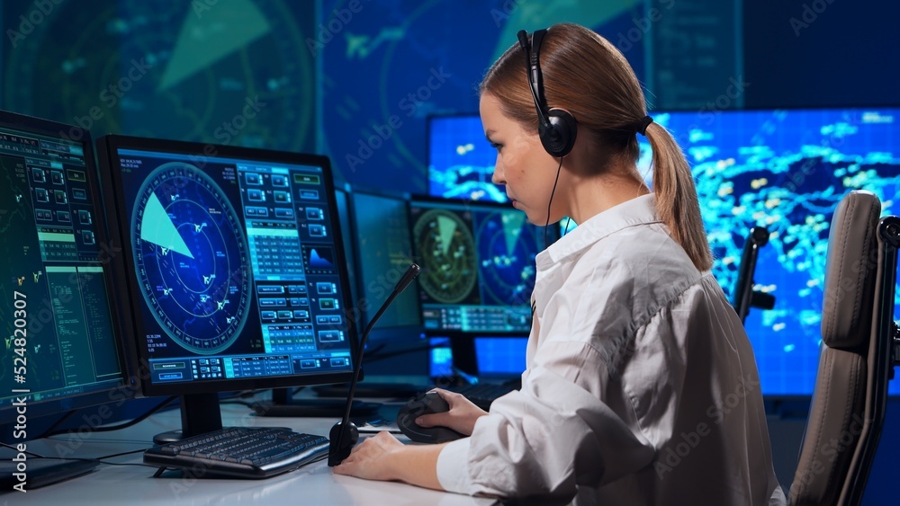 Workplace of the air traffic controllers in the control tower. Team of professional aircraft control officers works using radar, computer navigation and digital maps. Aviation concept.