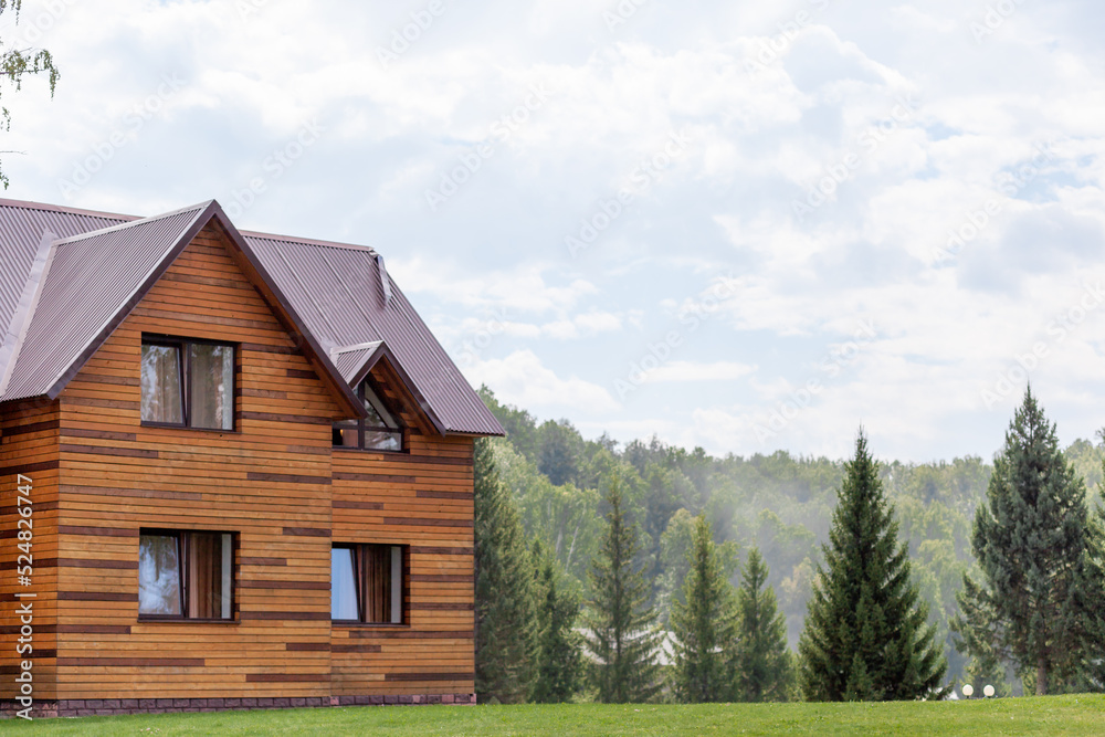 Two-storey wooden cottage with windows nature with a green lawn. Sale or purchase of new houses. A hotel for tourists.