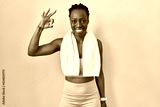Beautiful black woman wearing sportswear and towel over pink background smiling positive doing ok sign with hand and fingers. successful expression.