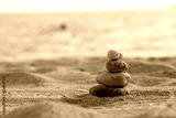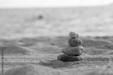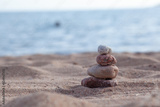 Round stones lie on top of each other in a column on the seashore on a sunny summer day. The concept of order and tranquility