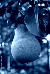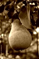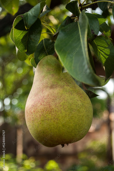 A ripe pear on a tree in the garden. Green living and eco-friendly products. The concept of agriculture, healthy eating, organic food