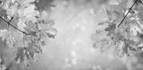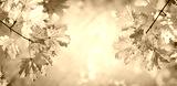 Autumn yellow maple leaves on a blurred forest background, very shallow focus. Colorful foliage in the autumn park. Excellent background on the theme of autumn. Panoramic view.