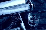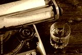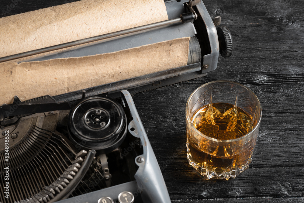 Whiskey in the glass and retro typewriter on the old wooden table background close up.