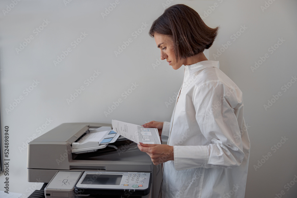 Focused woman worker scanning document on photocopy machine In modern office. Blurred background