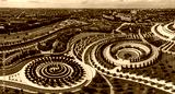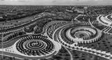 three large flower beds in a city park in the northeast of Krasnodar (South of Russia) - aerial panorama on a sunny day