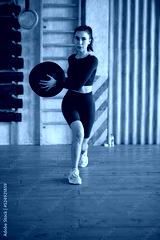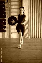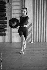 Young woman doing lunges with a medicine ball
