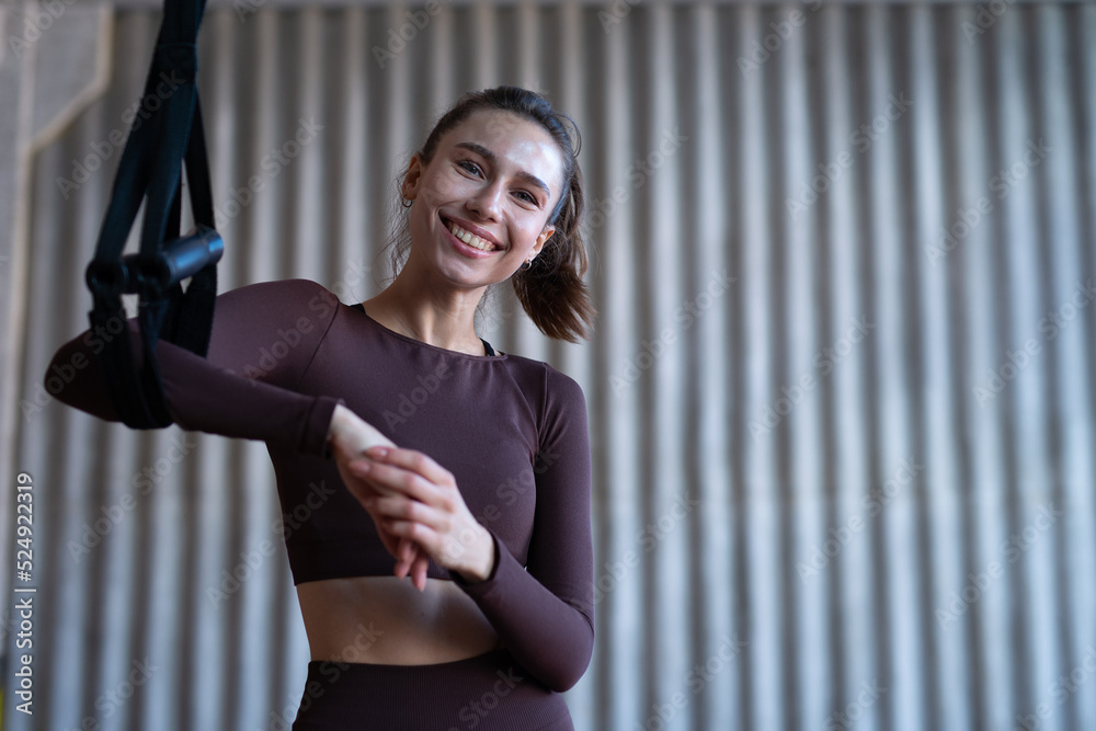 Fit woman standing in the gym with trx
