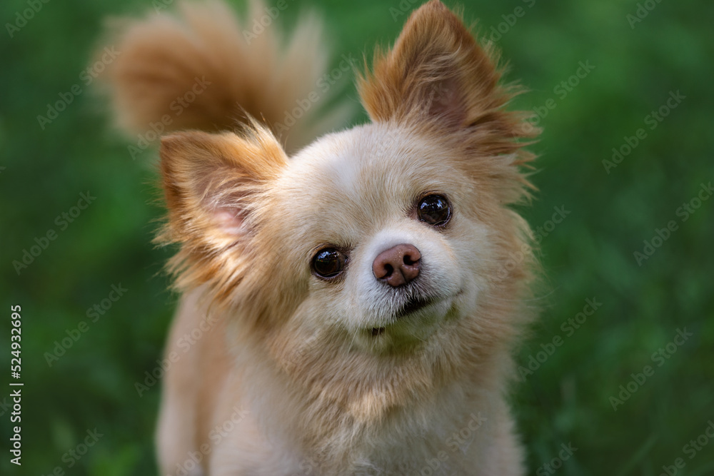 Portrait of a small cute dog Chihuahua .Green background