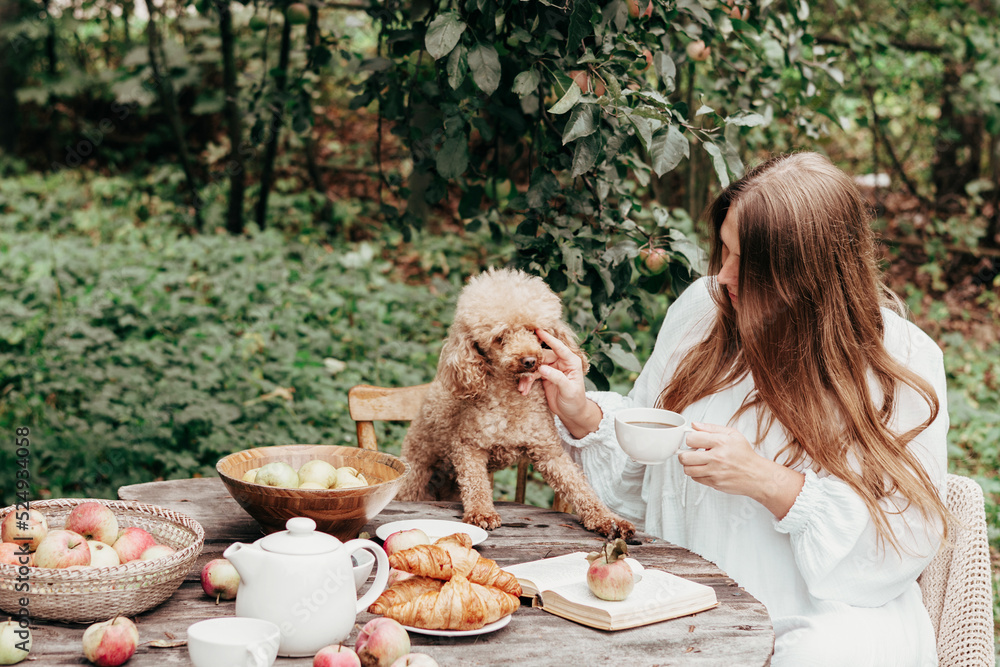 young woman model plus size in white dress sit at table with pet dog poodle, resting and drinking tea after harvesting autumn in back yard, fall and harvest, zero waste life, eco-friendly simple life