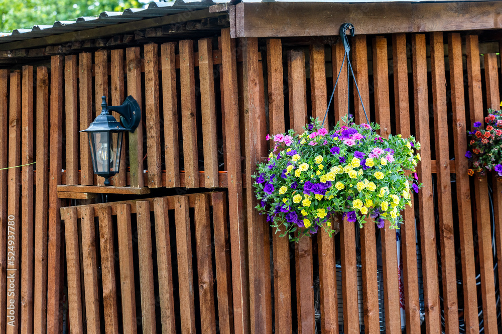 Pot of bright blooming flowers hanging on a wooden rustic barn wall