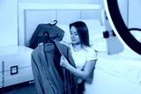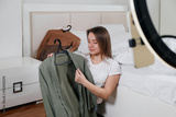 Female Blogger Recording Vlog Video on smartphone At Home Online Influencer On near bed choosing clothes, earthly look