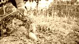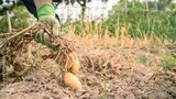 Male farmer collecting harvests his potatoes in garden. Man gathered potatoes