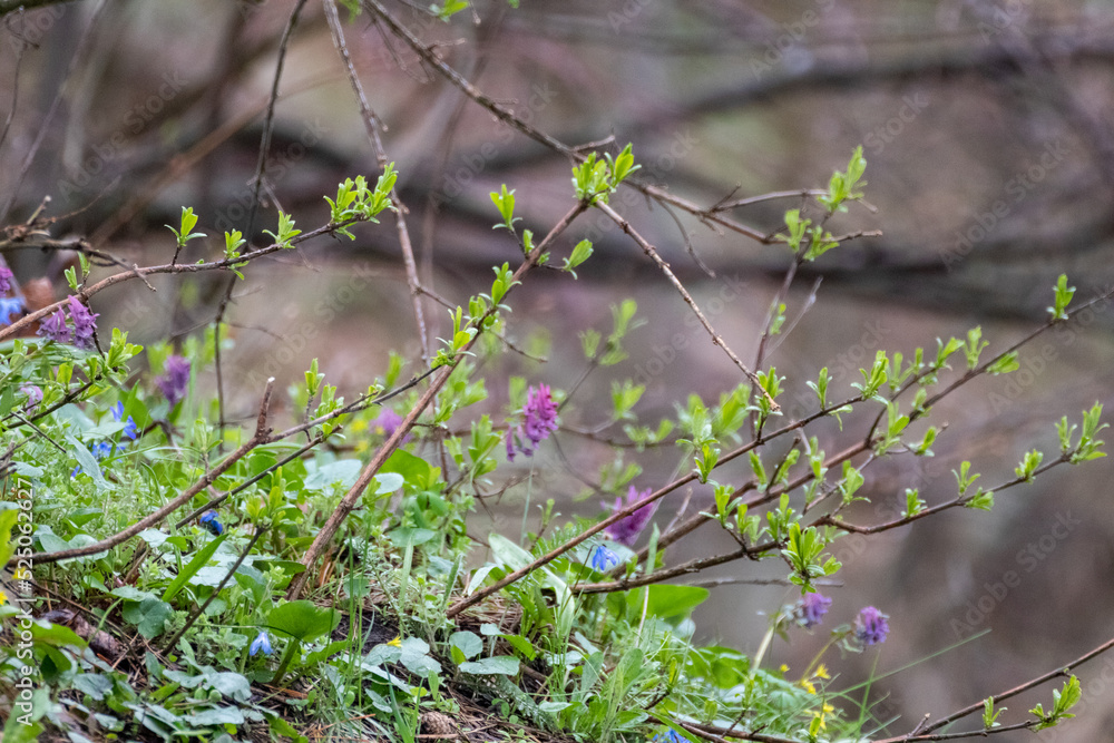 Blooming Scilla bifolia and Corydalis cava with young green branches in wild forest. Spring flowers in greenery with blurred background