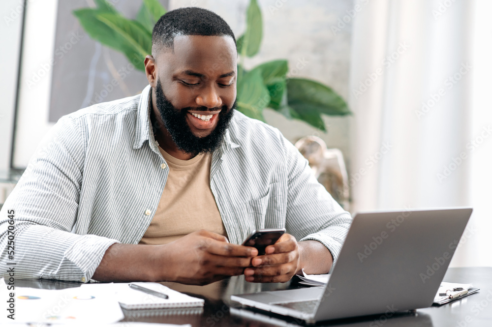 Busy positive African American man, manager, entrepreneur, sitting at a desk in the office, using his smartphone, chatting in social networks, answering messages, browsing the internet, smiling