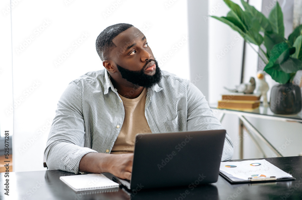 Pensive upset African American businessman, ceo, office worker, sits in modern office at a table, at his workplace, looks thoughtfully to the side, thinks about a new project, dreams of rest, vacation