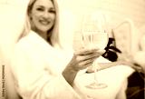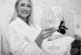 Beautiful woman with glass of refreshing lime drink during intravenous detox therapy with IV drip Infusion. Detox treatments at spa