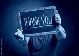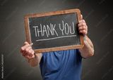 thank you - white chalk writing on a slate blackboard held by a men, gratitude and communication concept
