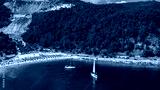 Top aerial view of famous Marble beach ai Thassos island, Greece