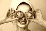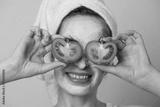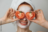 Portrait of caucasian young woman with white cosmetic mask on face and slices of tomato on eyes posing over grey background. Concept of skincare and regular procedure.