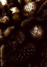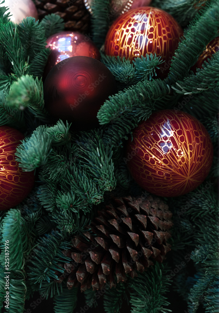 Beautiful fir tree decorations and lights of traditional Christmas fair. Holidays concept. Winter holiday season background.