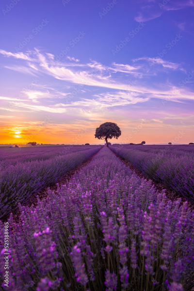 Lavender field at sunset with purple flowers, Brihuega. Guadalajara, Spain. vertical photo