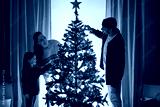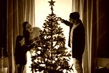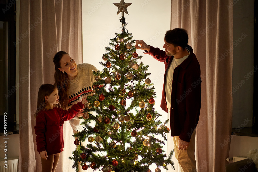 family, winter holidays and people concept - happy mother, father and little daughter decorating christmas tree at home