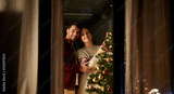 winter holidays and people concept - happy couple decorating christmas tree at home