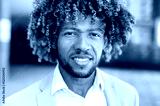 Close-up photo of a handsome charismatic confident curly haired brazilian or hispanic man, successful entrepreneur, standing outdoors, looking at the camera, smiling friendly