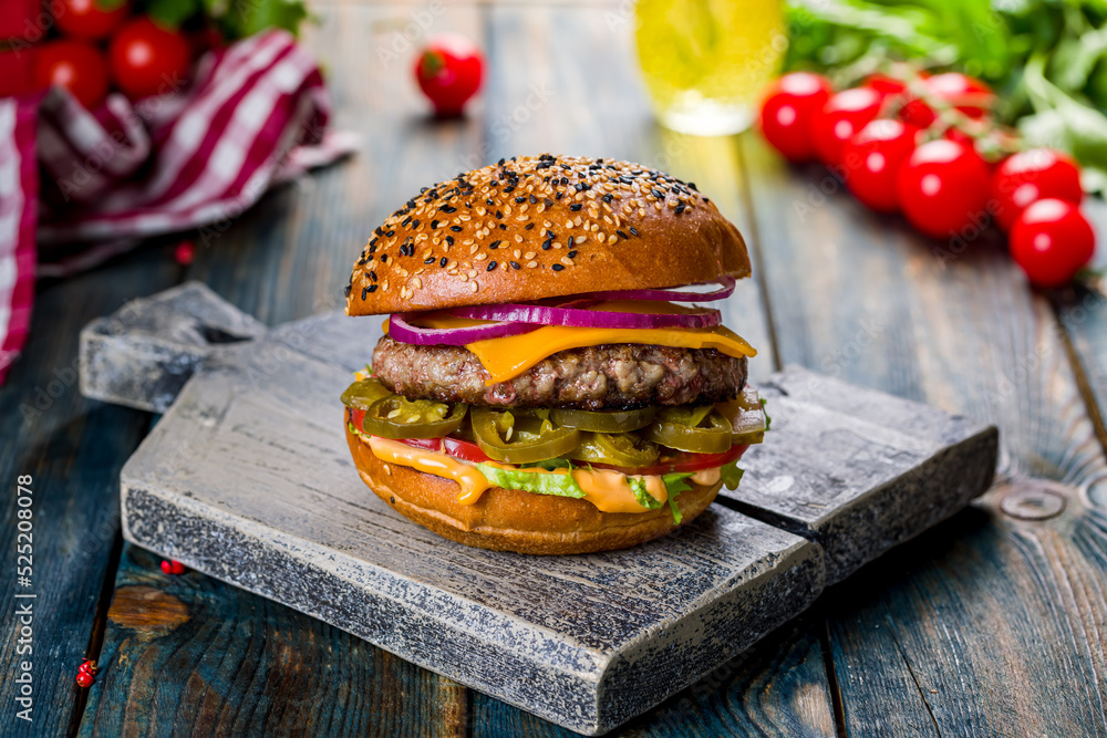 Burger with meat Patty and jalapeno, vegetables and red onion on the board