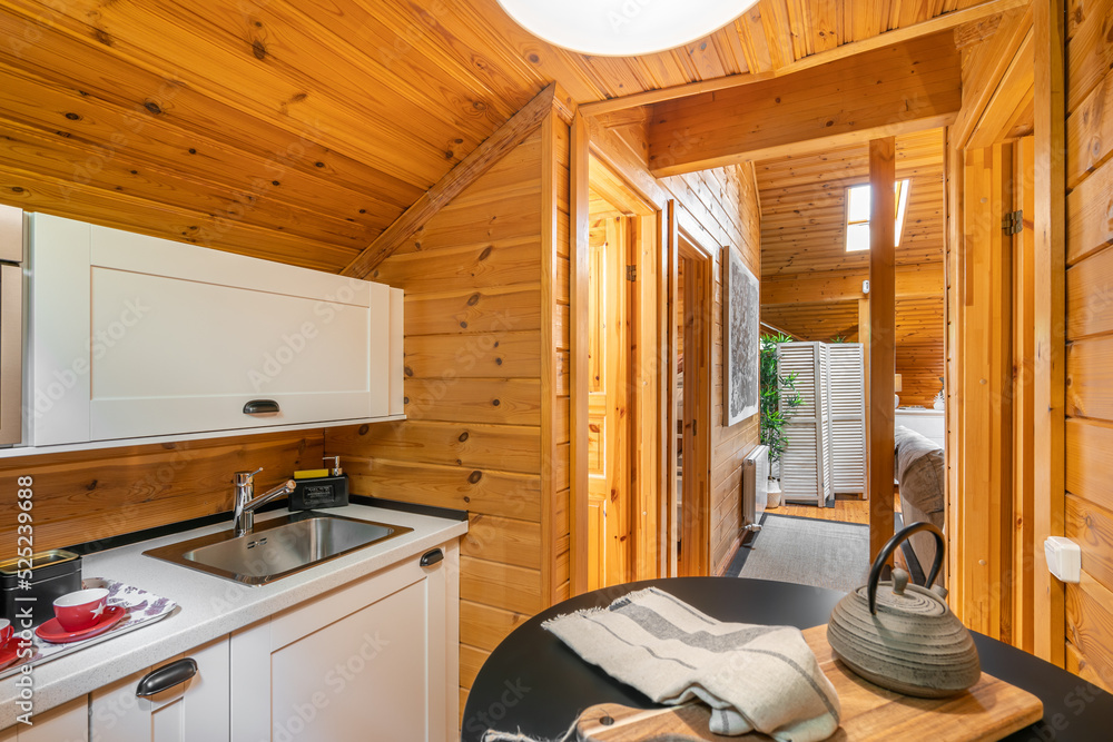 Small kitchen with compact furniture and view to the hallway in wooden house. Village life concept.