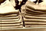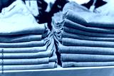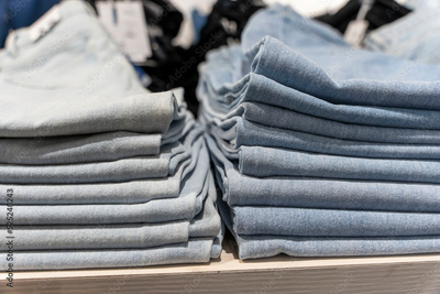 a stack of blue jeans on a shelf in the store. fashion clothing store