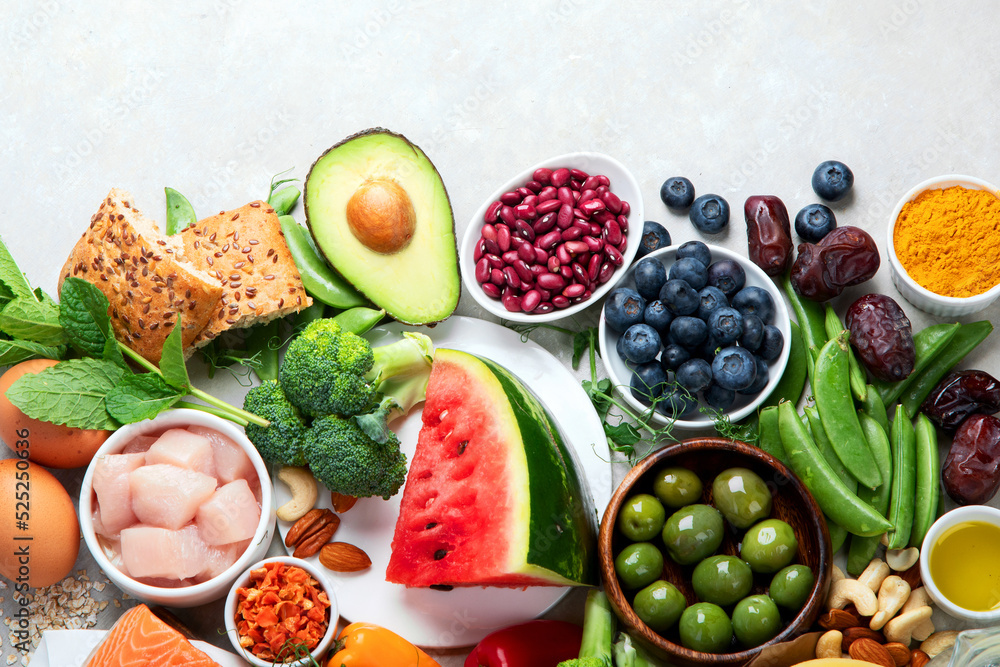 Healthy food assortment on light background.