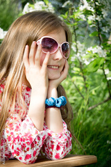 Little girl with a book sitting on the green grass
